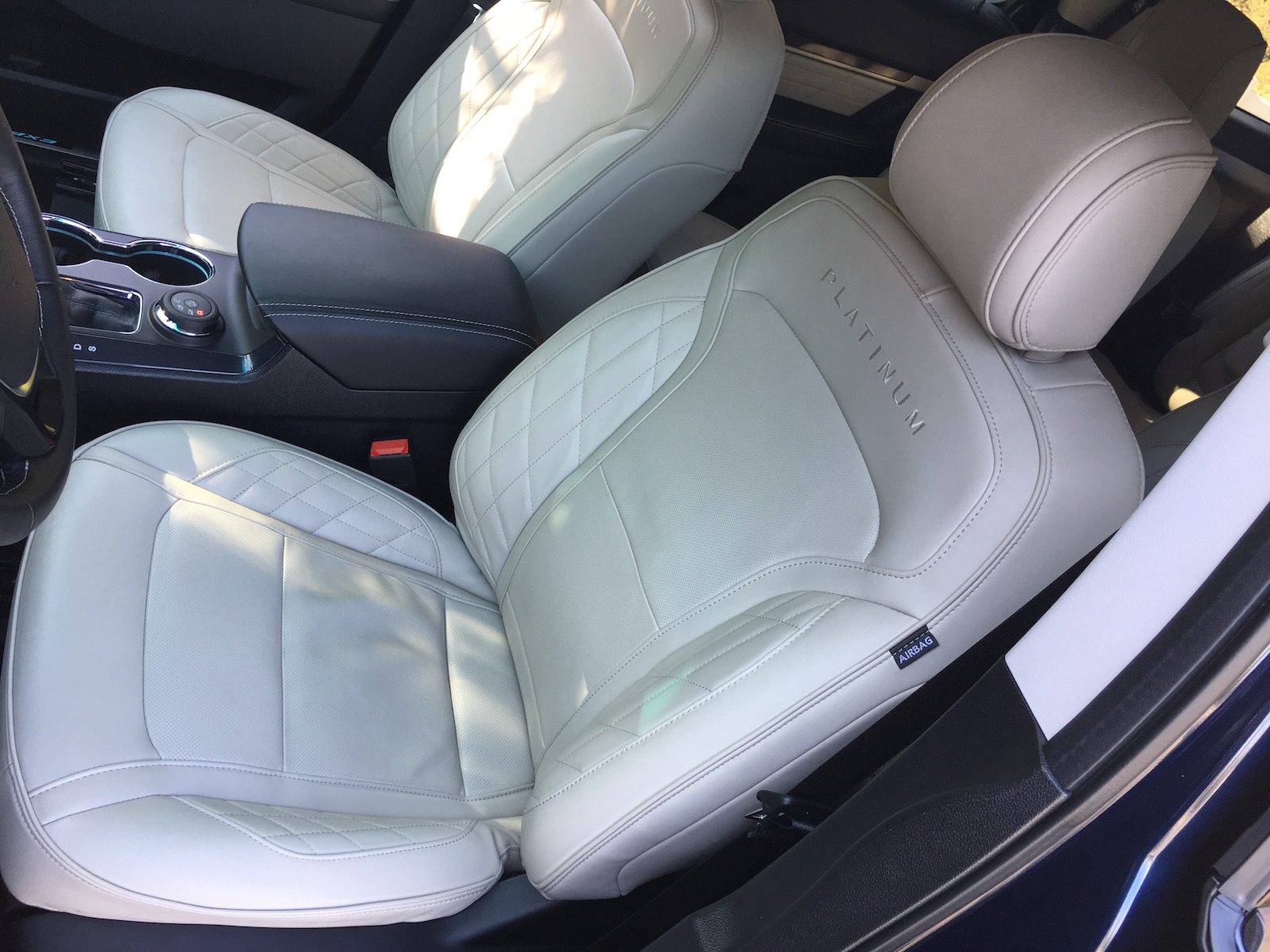 I was immediately taken back by the nearly white “nirvana” leather seats. Ford says they’re “medium soft cream”, but all I could think about were the messes my kids make and what their car seats used to do to the leather in our vehicles. But it was absolutely beautiful! I couldn’t wait to look further inside. The 2nd row ($845 worth of upgrades as I mentioned) was worth it. I know, I know.. I didn’t pay for it, but I would. It just made the whole interior look less SUVish and less “let’s pile the whole neighborhood in our car and go to the theater.” Luxury. Not station wagon.