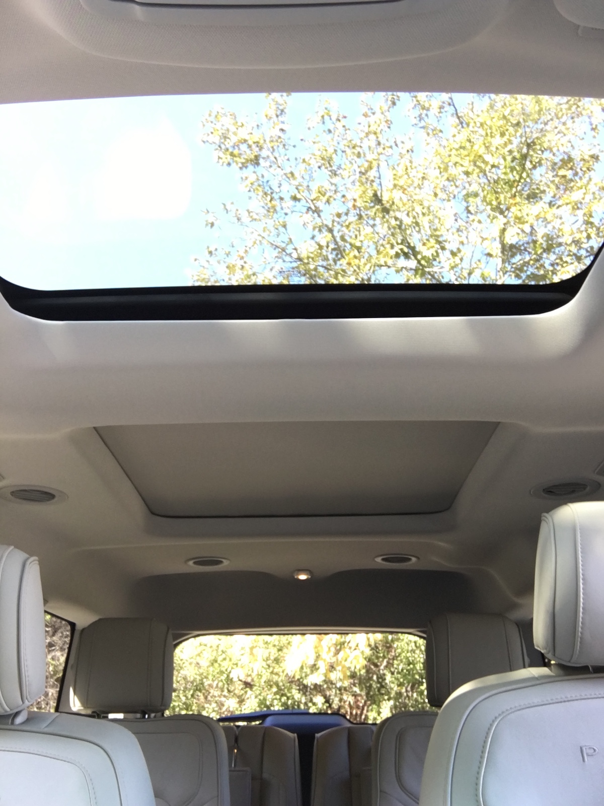 Immediately I noticed this was not your typical Explorer. First off, it’s a 4WD with the 3.5L V6 EcoBoost engine and 6-speed automatic transmission. Plenty of power for this SUV, considering it’s the exact same powerplant in the full size F-150 truck I recently drove. I loved the blue color, the 20″ wheels and chrome exhaust tips, not to mention the LED headlights and tail lamps. Oh, what’s that up on top? One of those mega moon roofs? Yussssss. I cracked open the door to see what was inside…