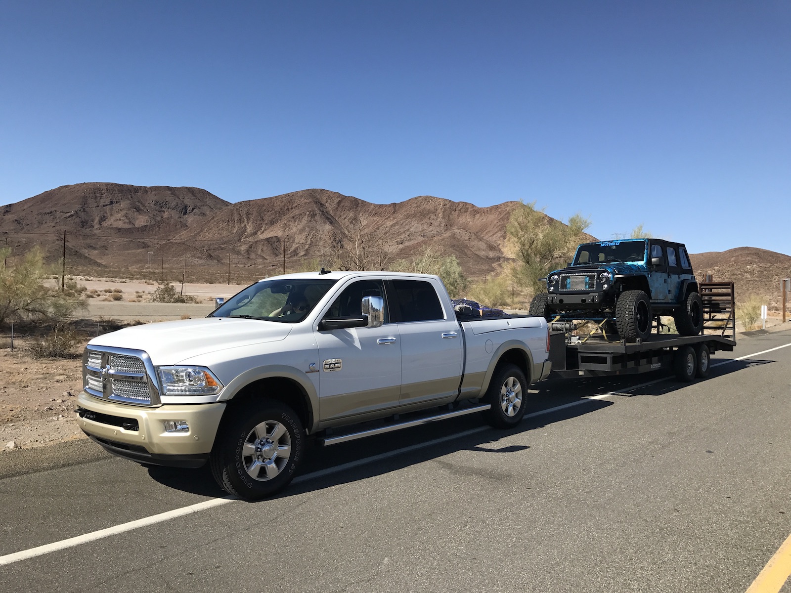 After being handed the keys, I knew exactly how I was going to challenge this 2016 Ram. Instead of an easy long-weekend, it’d be used to tow a 5,000 lb. trailer, with a 5,000 lb. Jeep Wrangler for Motorz TV on top, from San Diego to Las Vegas to be a featured project vehicle at the 2016 SEMA Show. That kind of road trip is an ideal test for a pickup, as it demands quite a lot from the powertrain, suspension and three passengers inside. Immediately after setting off, one thing was perfectly clear: this Ram is an absolute tower of power.