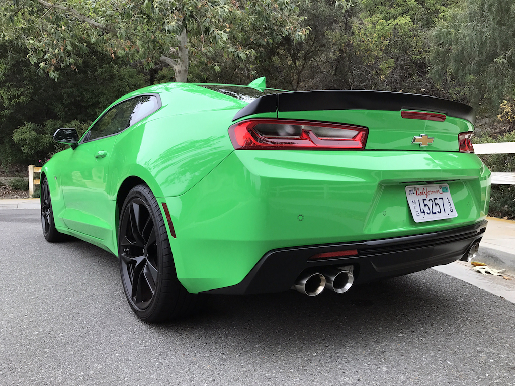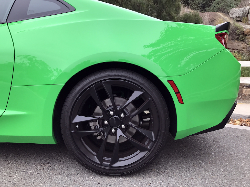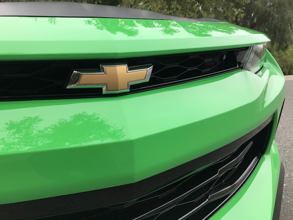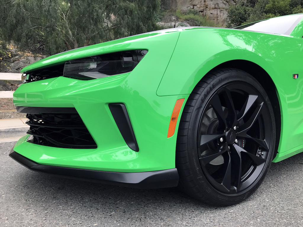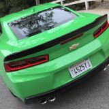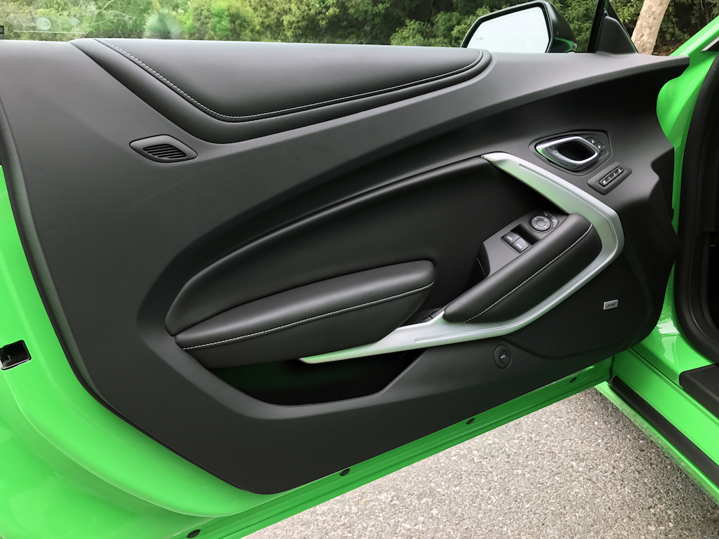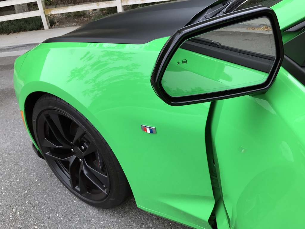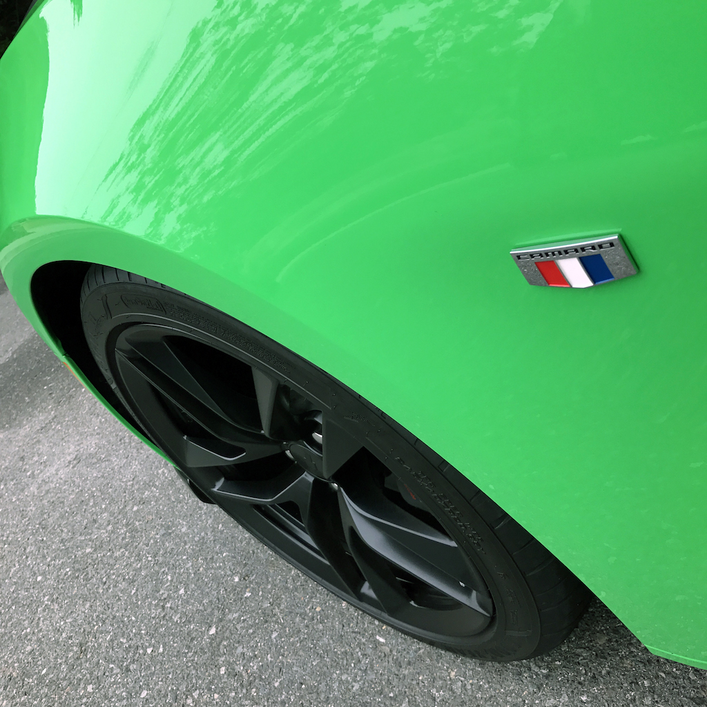 Now. With all of that out of the way, let’s get to this Camaro’s exterior. Krypton Green ($395 option) is one of those colors you either love or hate. Frankly, I’m not sure how you could hate it, because in person it’s staggeringly good looking. Trust me when I say photos will never begin to do it justice. Combined with black 20″ aluminum wheels, and satin black blade spoiler, front splitter and hood wrap, this isn’t just another muscle car. It’s a statement. For some, it could be a little loud. Personally, I think it beautifully matches the character of the car and makes the crisp lines that much more potent. You could drive a very, very long way and not come across a muscle car this visually arresting.