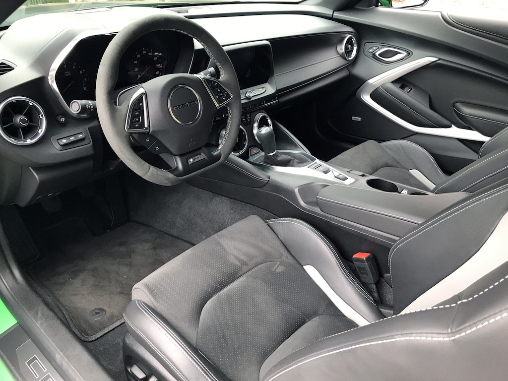 Beyond the powertrain, a host of other options help to further this Camaro’s credentials. You’ll absolutely want to check the box for the Recaro seats ($1,195), which strike a near perfect balance of support and comfort. I’d also spring for the Convenience and Lighting Package ($2,800). The heads-up display included in that pack is worth the price of admission alone. I also got a kick out of the suede steering wheel and shift knob (but wonder how they would look after a few years of daily use). The massive Brembo front brakes are included as part of the 1LE Track Performance Package (which is worth every penny of the $4,500 price tag and then some).