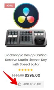 Go to this link to see what you’ll be ordering. If it says it’s out of stock, go to step 2. Take a look at all the details, especially the part about it being non-refundable. There’s lots of info on this page–and click the tabs below the photos for even more details.- If that page shows it as being out of stock, go to this link. This is how I had to order it but since then it has been corrected. You’ll notice here on the search results page is that item and an add-to-cart button. Click it and you’re on your way to getting both the software license key for 2 computers and a brand new Speed Editor for the same cost as the license alone.