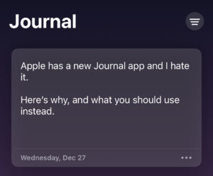 With iOS 17.2, Apple added a journaling app called “Journal”. I was so excited about it that I jumped on the first beta that had it. Now it’s released for everyone to use, and I absolutely hate it. Here’s why, and what you should use instead.