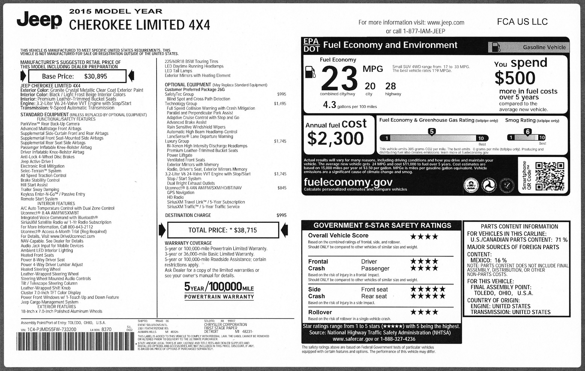 IMG_6284 copyReady for the best news? This 2015 Jeep Cherokee Limited is remarkably well priced. It starts at a pretty low $30,895 and can be had in the same spec as the vehicle I tested for $38,715. That’s pretty outstanding value for money, considering you’re getting a large 4×4 SUV, nine speed auto transmission, legendary Jeep ruggedness, tons of technology and a very healthy V6 powertrain. Ditch the auto start/stop and you’ll arrive at an even more agreeable figure.
