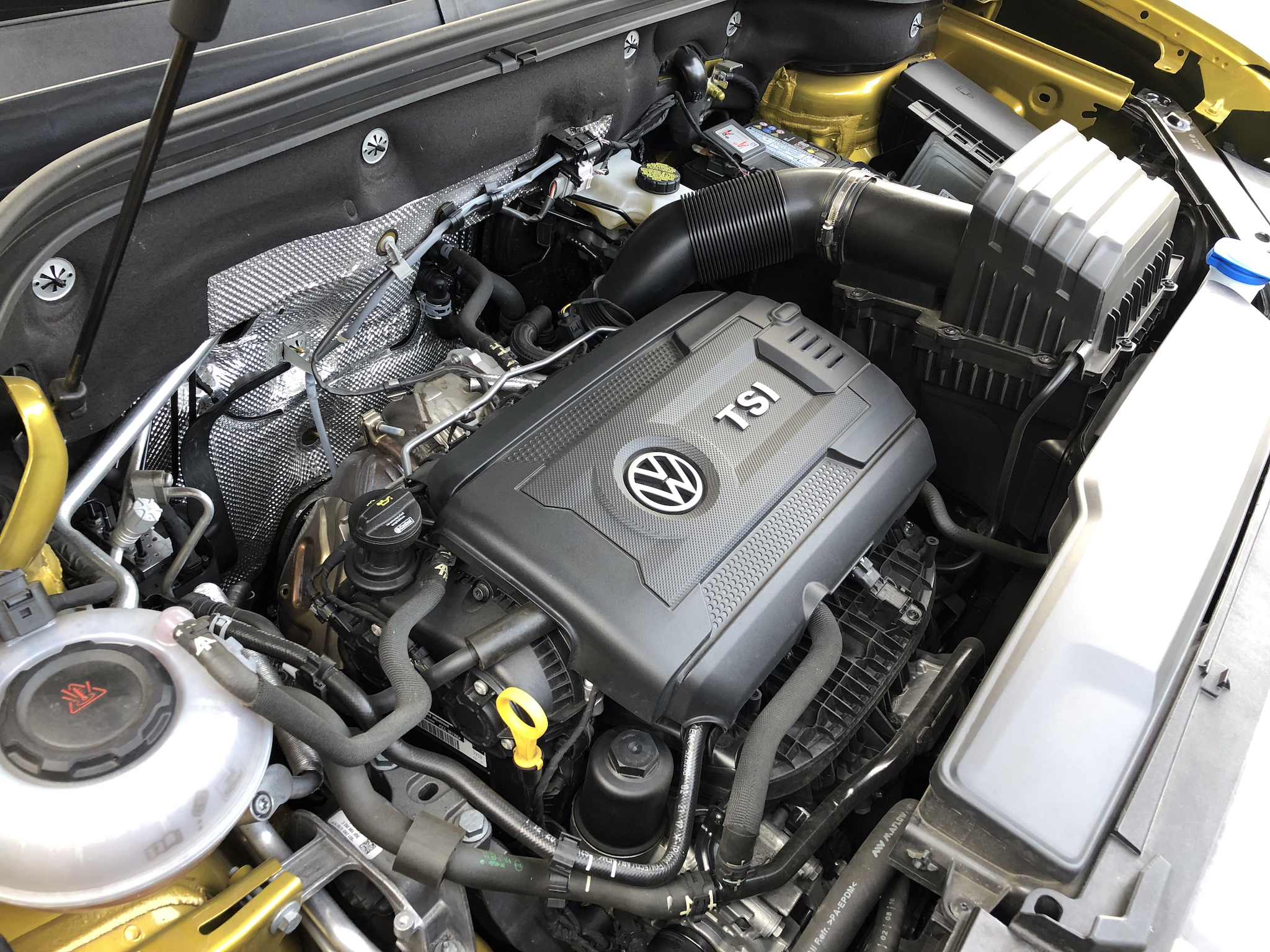 I had to check the specs of the Atlas to make sure. Then I popped the hood to make sure. I still wasn’t convinced :) Speaking of which, it’s odd to see such a small engine inside the engine bay of such a large vehicle. Take a look at my photos, below. If you propped the hood up and then walked over to the vehicle from the driver’s side, the air box completely hides the engine. It sits far lower. You can’t even see the engine at first. You literally have to walk over to the fender and look down. It’s that dramatic.