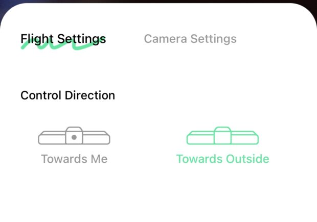 There’s one additional setting that I highly recommend you change, otherwise the controls may seem backwards for you. Within the Hover X1 app, go to the settings while in manual mode and change the Flight Settings control direction to “Towards Outside”: