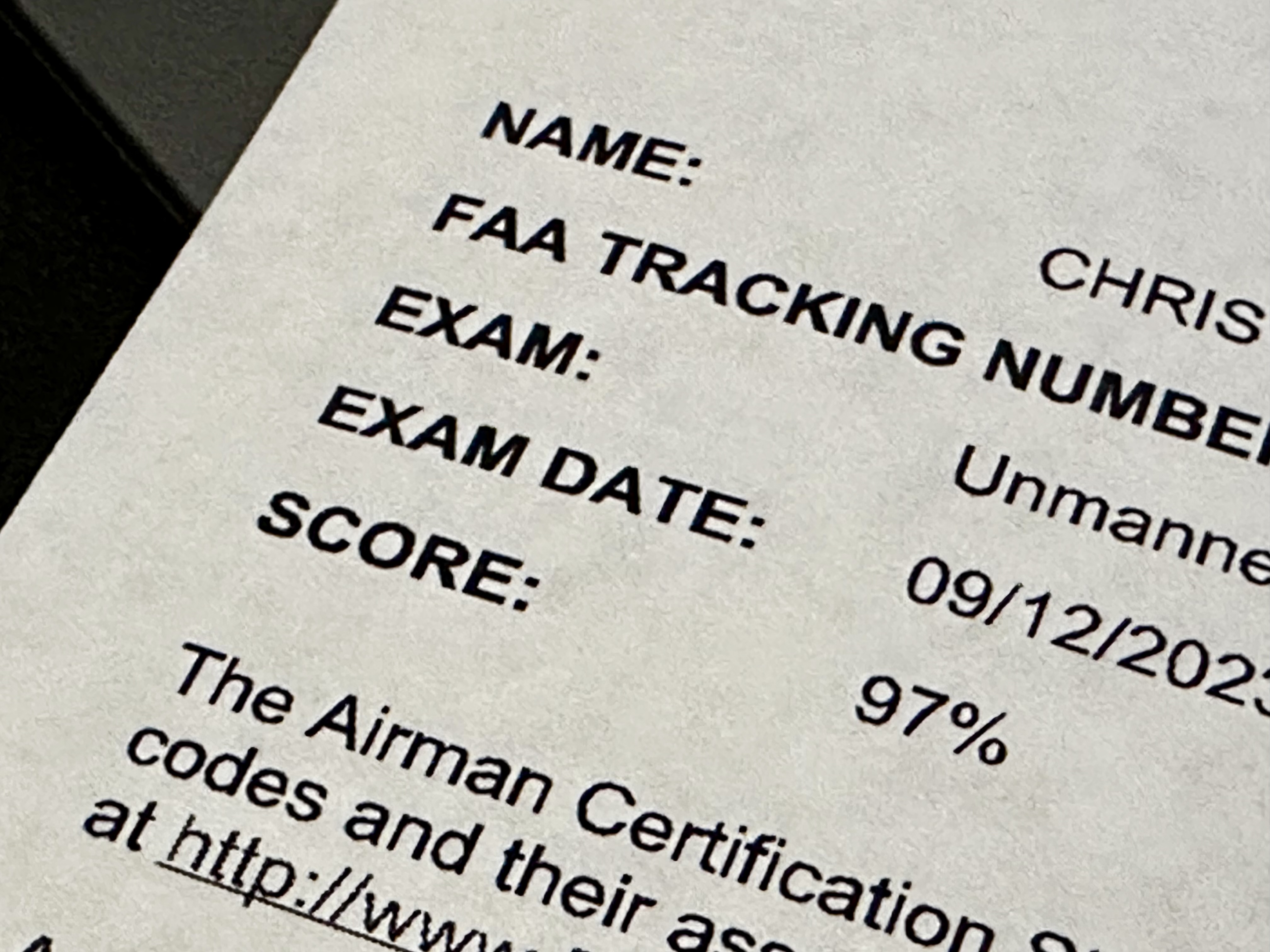 After 3 weeks of studying hard nearly every day, I went to my local testing center to take the FAA Part 107 test to become a commercial UAS pilot. About 80 minutes later I got my score and was shocked and elated to see that I got 97%.