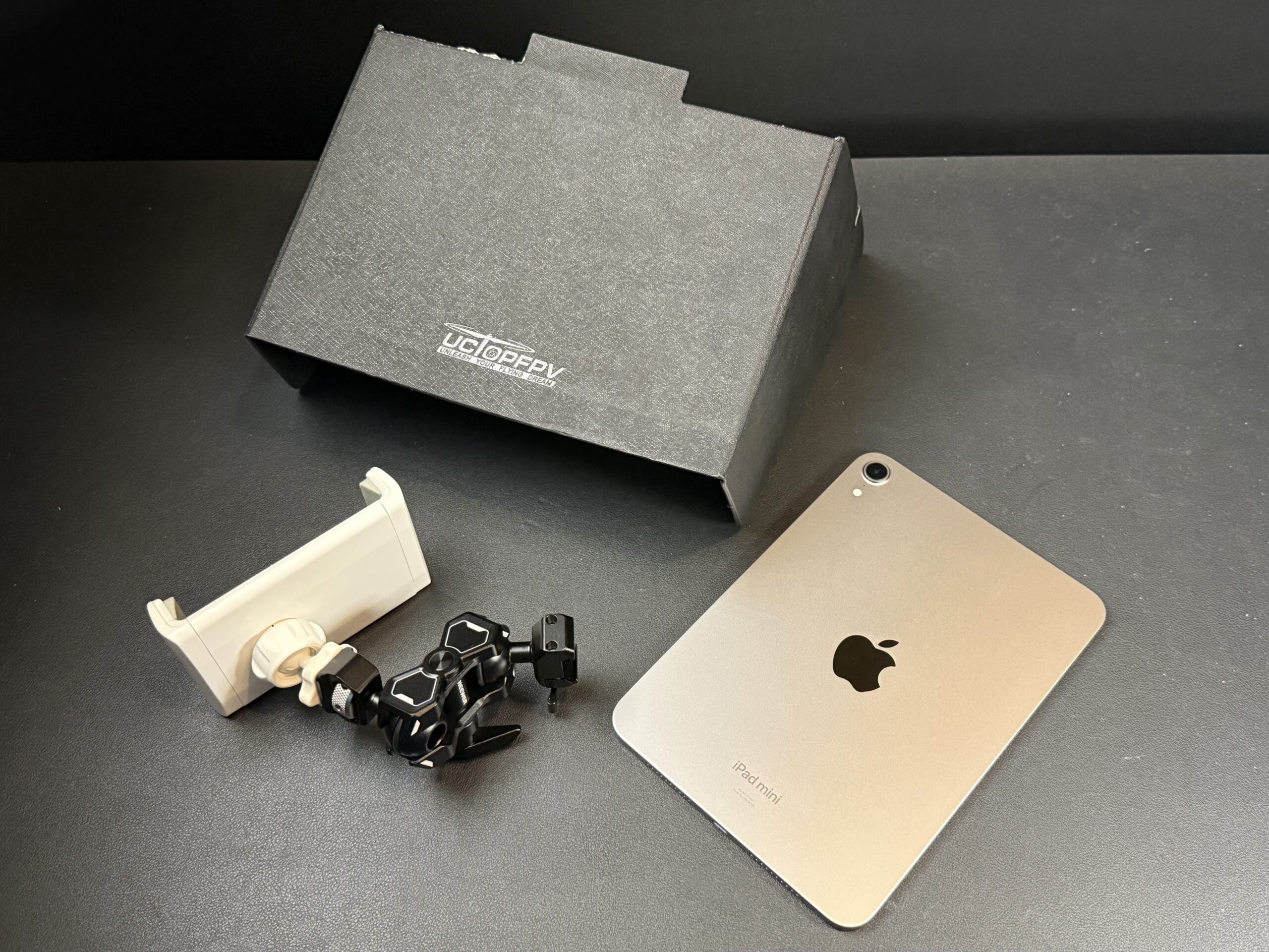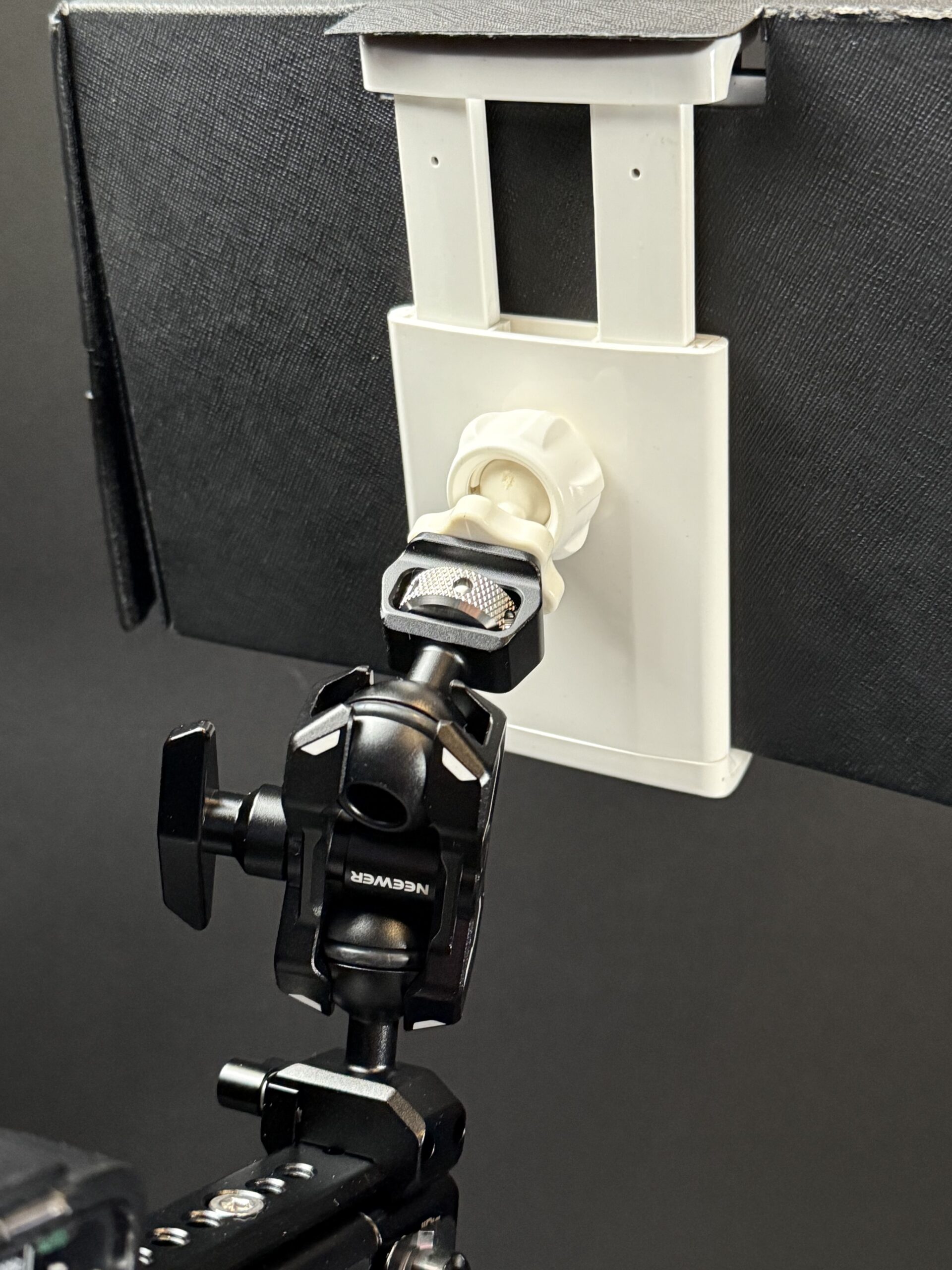 The provided mount, as mentioned previously, is designed mainly for DJI drone remote controllers. But upon closer inspection, the tripod mounting ball head has a 1/4-20 thread on the back of it! Yes! This means I can rig up something using my 1/4-20 threaded magic arms. I don’t need the plate they provided, or the other parts. The only parts I ended up needing is the sun shade (obviously), their mounting clamp, and one ball head along with the pressure screw for the ball/clamp. The rest I tossed. This solution holds the iPad mini firmly in place (no wobbling) and works great! The only thing I don’t like about it is the white color (which matches the intended use of DJI remote controllers, not my all-black camera rig).